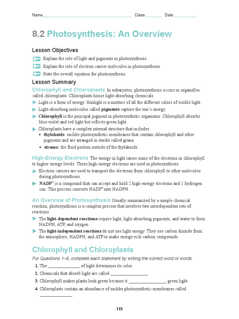CHAPTER 8.2 Practice Answer KEY Chloroplasts contain an abundance of saclike photosynthetic membranes called thylakoids . 5. The stroma is the fluid portion of the chloroplast located outside ...
