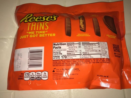 Calories in Reese's Peanut Butter Cups Thins and Nutrition Facts Reese's Peanut Butter Cups Thins Nutrition Facts Serving Size 3 pieces (33 g) Amount Per Serving Calories 170 % Daily Values* Total Fat 10.00g 13% Saturated Fat 5.000g 25% Trans Fat - Cholesterol 5mg 2% Sodium 60mg 3% Total Carbohydrate 20.00g 7% Dietary Fiber 1.0g 4% Sugars 18.00g Protein 3.00g Vitamin D - Calcium - Iron - Potassium - REESE'S - Thins Dark Chocolate Peanut Butter Cups - SmartLabel™ Thins Dark Chocolate Peanut Butter Cups. net wt. 3.1 oz. 00034000460649. Nutrition . Ingredients . Allergens . ... % Daily Value (DV) tells you how much a nutrient in a serving of food contributes to a daily diet. 2,000 calories a day is used for general nutrition advice. . . . . . . ... REESE'S Information confirmed ...
