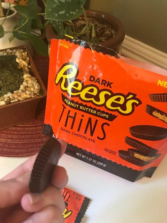 Nutrition Facts for Reese's Dark Chocolate Thins - MyFoodDiary Reese's Dark Chocolate Thins Nutrition Facts Serving Size pieces 3 pieces = 33g Amount Per Serving 170 Calories % Daily Value* 17% Total Fat 11g 30% Saturated Fat 6g Trans Fat 0g 1% Cholesterol 2mg 2% Sodium 50mg 6% Total Carbohydrate 18g 7% Dietary Fiber 2g Total Sugars 15g 30% Includes 15g Added Sugars Protein 3g 0% Vitamin D 0mcg 0% Calcium 0mg Reese's Thins Calories, Carbs & Nutrition Facts | MyFitnessPal Reese's Thins Serving Size: 1 piece 55 Cal 44% 6.5g Carbs 50% 3.3g Fat 7% 1g Protein Track macros, calories, and more with MyFitnessPal. Join for free! Daily Goals How does this food fit into your daily goals? Calorie Goal 1945 Cal 55/2000Cal left Fitness Goals: Heart Healthy Fat 63.7 g 3.3/67g left Sodium 2278.7 mg 21.3/2300mg left