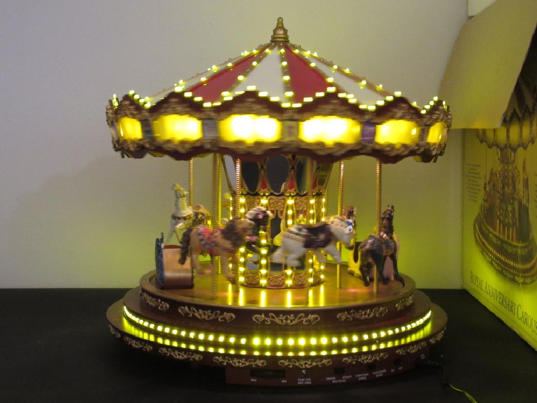 Gold Label Royal Anniversary Musical Carousel - YouTube exquisitely detailed animated Carousel that plays 20 all-time classics and 20 Christmas carols, with... Mr. Christmas Gold Label Animated Musical, The Carousel Collectible animated carousel makes a captivating holiday decoration. Velvet canopy roof, colorful animals, sparkly mirrors, and spotlights. Plays 30 songs--15 Christmas carols and 15 year-round classics. Scaled to complement other World's Fair items; UL-listed; A/C adapter included. Measures approximately 10 inches in diameter by 12 inches tall.