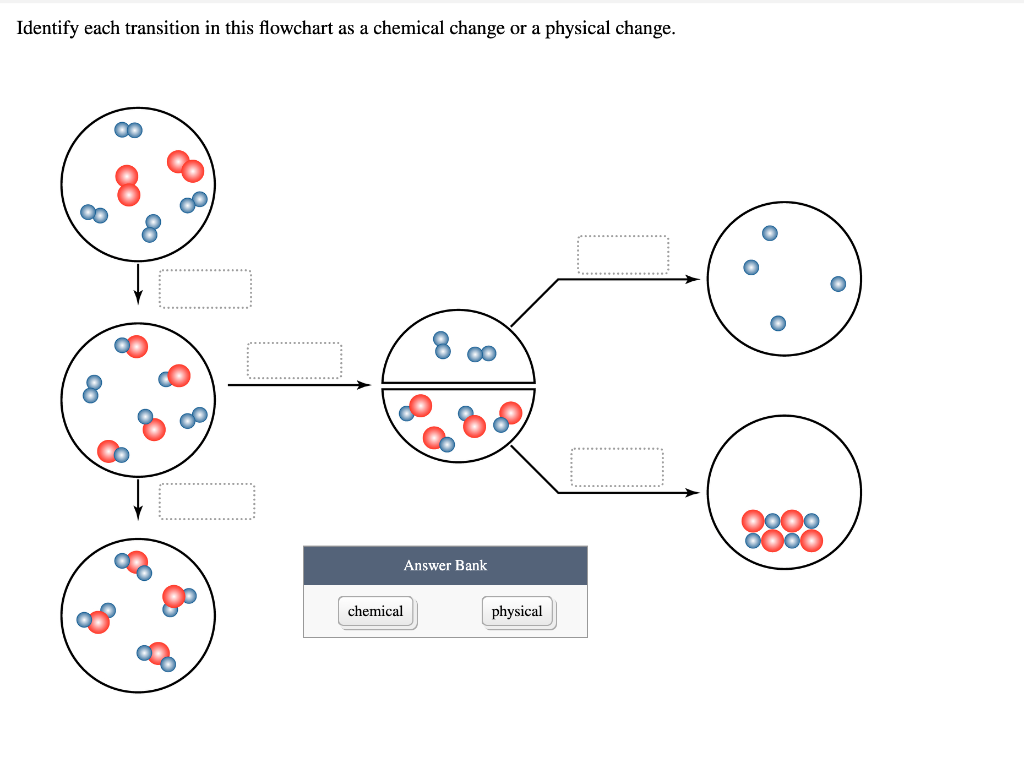 Label each transition in this flow chart as a chemical ... - Brainly.com Expert-Verified Answer · Referring to the attached picture, transitions 1, 2 and 4 are chemical changes, whereas transitions 3 and 5 are physical changes. Label each transition in this flow chart as a chemical ... - Brainly.com We can see new substance (red-blue) is formed from two blue and one red atoms. 3) MIddle: a physical change. There is no new substance. Bonds ... Sapling Learning Ch. 3 Flashcards - Quizlet Label each transition in this flow chart as a chemical change or a physical change. ... A to B: same but red and blue sets mixed. B to C: formed sets of threes ...